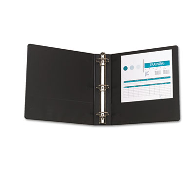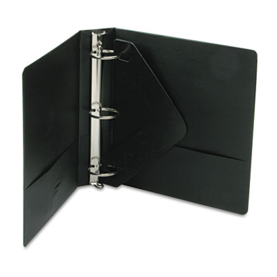 Customizable covers and spine allow you to create the perfect presentation. Round ring mechanism with open and close triggers ensures easy access to documents. Two inside pockets provide storage space for loose sheets. Capacity Range [Max]: 2"; Sheet Capacity: 375; Color(s): Black.
