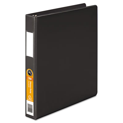 Special No-Gap D-ring design keeps sheets from slipping through rings. D-rings hold 40% more sheets than same size round rings. Pocket Guards hold papers securely within binder. Label holder sleeve on spine provides quick and easy identification of contents. Tough, long-lasting hinge for added durability. PVC-free. Capacity Range [Max]: 1"; Sheet Capacity: 275; Color(s): Black.