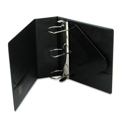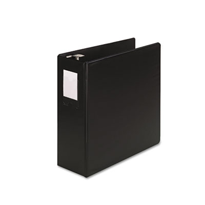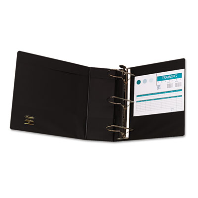 Special No-Gap D-ring design keeps sheets from slipping through rings. D-rings hold 40% more sheets than same size round rings. Pocket Guards hold papers securely within binder. Label holder sleeve on spine provides quick and easy identification of contents. Tough, long-lasting hinge for added durability. PVC-free. Capacity Range [Max]: 4"; Sheet Capacity: 780; Color(s): Black.