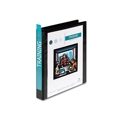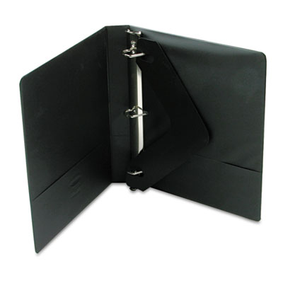 Increased-capacity, D-ring binder holds more paper than conventional round ring binders—all within a sleeker, slimmer profile. Binder rings are mounted on the back cover, making it easy to fold the cover back and under the binder. Folded back front cover can double as a handy writing surface. Two inside pockets provide additional storage. Sturdy, clear vinyl covers make labeling simple—plus they're tear and crack-resistant. PVC free. Capacity Range [Max]: 1"; Sheet Capacity: 220; Color(s): Black.