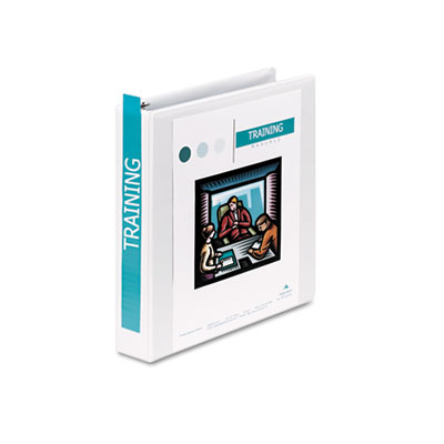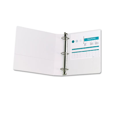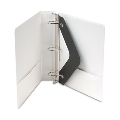 Increased-capacity, D-ring binder holds more paper than conventional round ring binders—all within a sleeker, slimmer profile. Binder rings are mounted on the back cover, making it easy to fold the cover back and under the binder. Folded back front cover can double as a handy writing surface. Two inside pockets provide additional storage. Sturdy, clear vinyl covers make labeling simple—plus they're tear and crack-resistant. PVC free. Capacity Range [Max]: 1 1/2"; Sheet Capacity: 350; Color(s): White.