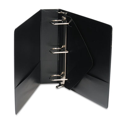 Increased-capacity, D-ring binder holds more paper than conventional round ring binders—all within a sleeker, slimmer profile. Binder rings are mounted on the back cover, making it easy to fold the cover back and under the binder. Folded back front cover can double as a handy writing surface. Two inside pockets provide additional storage. Sturdy, clear vinyl covers make labeling simple—plus they're tear and crack-resistant. PVC free. Capacity Range [Max]: 2"; Sheet Capacity: 480; Color(s): Black.