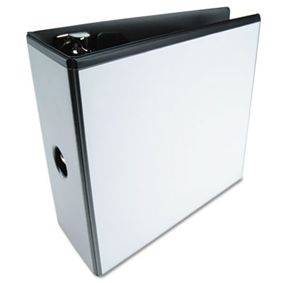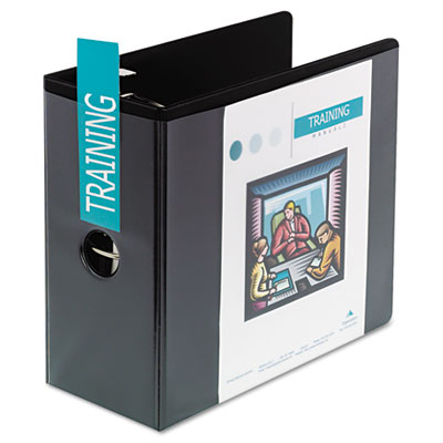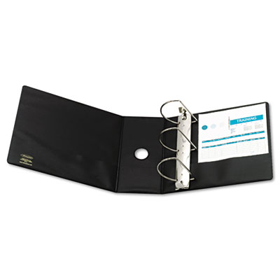 Increased-capacity, D-ring binder holds more paper than conventional round ring binders—all within a sleeker, slimmer profile. Binder rings are mounted on the back cover, making it easy to fold the cover back and under the binder. Folded back front cover can double as a handy writing surface. Two inside pockets provide additional storage. Sturdy, clear vinyl covers make labeling simple—plus they're tear and crack-resistant. PVC free. Capacity Range [Max]: 5"; Sheet Capacity: 950; Color(s): Black.
