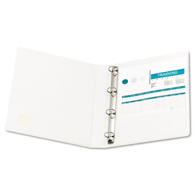 Solve international size document storage dilemmas with the binder designed to secure A4-sized paper. Specially aligned rings to fit European (11-5/8" x 8-1/8"), South American (11-5/8" x 8-1/2"), Australian and Asian paper sizes. Clear front cover and spine mean easy to customize for a professional appearance. Four back-mounted round rings allow the cover to fold under for a smooth writing surface. Two inside pockets for storing loose documents. Capacity Range [Max]: 1"; Sheet Capacity: 175; Color(s): White.