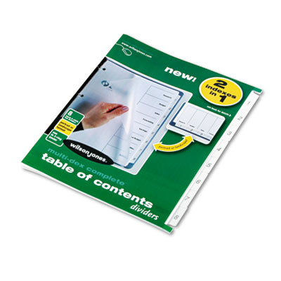 Just print or type titles on copymaster or laser practice sheet, then use a copier to produce as many sets as you need. Clear, textured poly cover sheet protects Table of Contents page. Three-hole punched for use in standard ring binders. Easy formatting with free templates available on manufacturer's website. Tab Style: 8-Tab; Tab Color(s): White; Index Divider Size: 11 x 8 1/2.